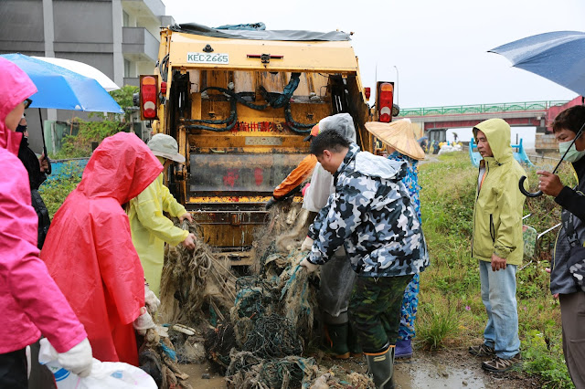 2020年淨灘活動在綿綿細雨中進行,氣溫大約只有22度。因為潮汐的關係,我們下午才展開淨灘的行動。在將近一個小時的淨灘時間,我們共移除了八百多公斤的垃圾。特別的是這次我們淨灘的地點就在河海交界處的彩虹橋下。如果垃圾沒有及時清走,廢漁網沒有被移除,它們有可能被潮汐帶到大海,不知道要禍害環境多久了!